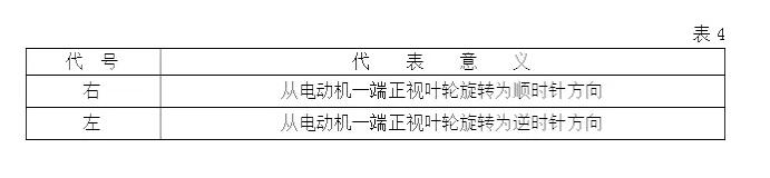 指葉輪旋轉的方向,按表(4)規(guī)定,用代號寫在傳動方式后。