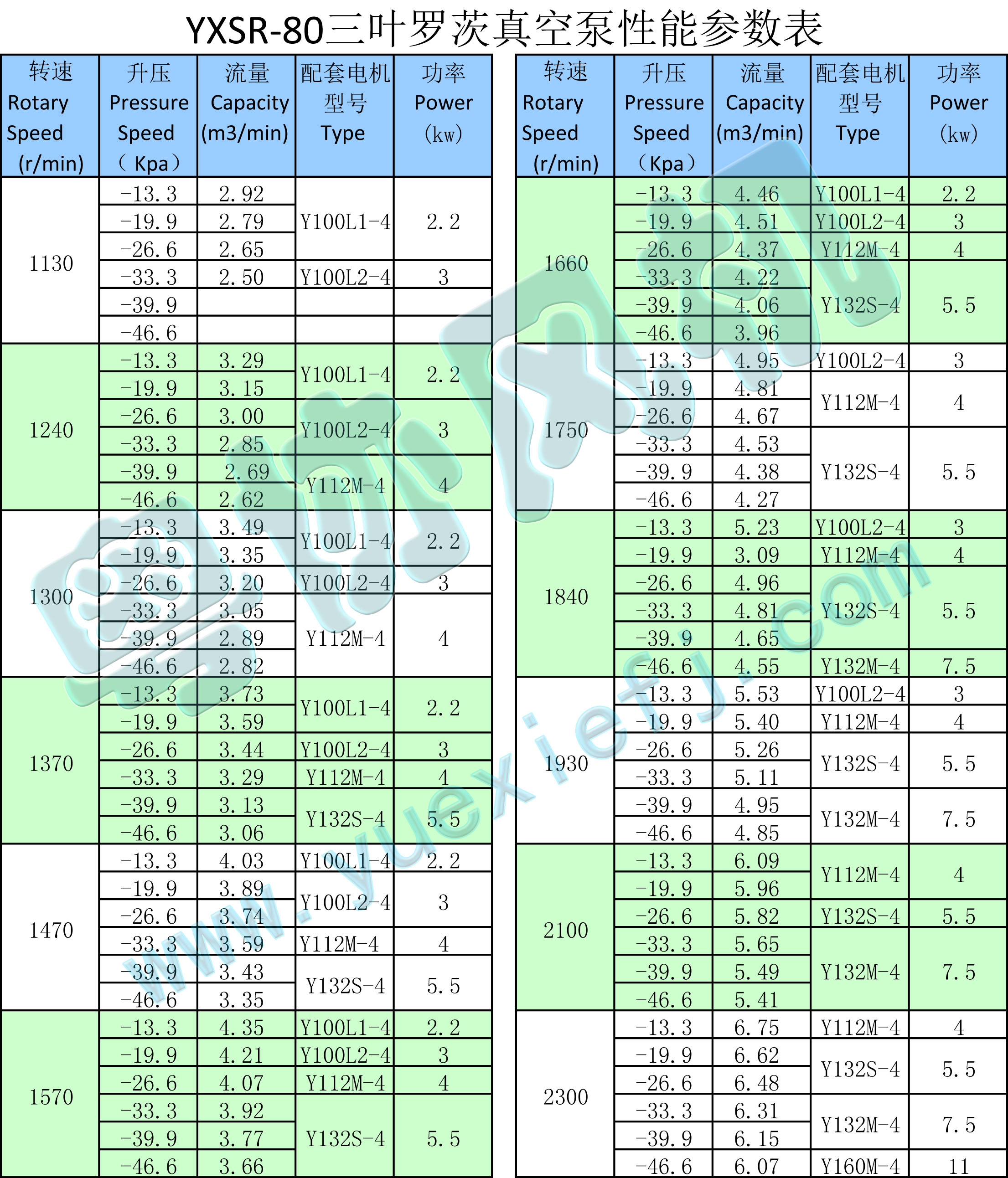- 產(chǎn)品簡介:三葉羅茨鼓風機有鼓氣和吸氣兩款,YXSR-80系列的三葉羅茨鼓風機的流量范圍在2.07~5.43m3/min之間。
